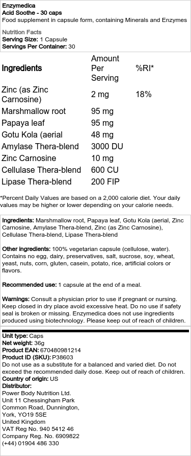 To Acid Soothe einai sxediásmeno na tairiazei se enan energitiko tropo zwhs kai na symplhrwnei mia ygeia diatrofi. Me tin aplopoiimenh morfi se kapsoules, to proion auto einai efkolo sto katheiligma kai mporei na paraxei mia isorropimenh ypostirixi stis kiniseis sas kata ti diarkeia tis imeras. Ean psaxnete gia ena fysiko proion pou tha symplirosei ti dieta sas xoris ypertivan kliseis i uposxeseis, to Acid Soothe apo tin Enzymedica mporei na einai i epilogí sas.