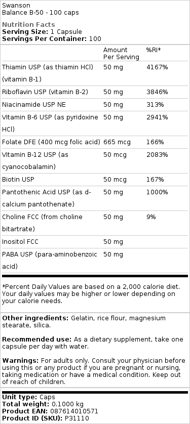 Balance B-50 Complex fra Swanson er et fantastisk komplet vitamin B-kompleks baseret supplement, der fungerer godt til at understøtte generel sundhed og velvære, og jeg føler et vigtigt nøglesupplement, der fungerer godt hovedsageligt til at understøtte mine fedttabsfaser, jeg har en tendens til at bruge en række høje doser vitamin b-tilskud og multivitaminer under mine diætfaser og finder ud af, at det højere indtag af essentielle b-vitaminer fungerer godt for at understøtte optimale energiniveauer og giver mig mulighed for at have mere produktive dage og træningssessioner, når jeg løber på lavere kalorier, jeg føler, at b-vitaminer er et essentielt supplement til at hjælpe med at forbedre fedttab, når du er på slankekur og løb i moderat til hårdt kalorieunderskud og kombinerer godt med yderligere kosttilskud såsom L-Carnitin, grøn teekstrakt og CLA for at forbedre resultaterne af fedttab. Generelt føler jeg, at dette er et komplet veldoseret komplet B-vitaminbaseret tilskud, der fungerer godt til ikke kun at hjælpe med at give anstændige energiniveauer, men også til at fremme optimal hjernefunktion og kardiovaskulær sundhed, så det fungerer fantastisk som et dagligt sundhedstilskud året rundt, som jeg anbefaler tilføjer til både lean mass gaining såvel som fedttabsfaser enten selvstændige eller med yderligere vitamin- og mineraltilskud og et fiskeoliebaseret kosttilskud af høj kvalitet. Dette er et B-vitaminkomplekstilskud af høj kvalitet, som jeg føler fungerer godt, når det indtages med kun 1 kapsel om dagen, hvilket gør det til et ganske omkostningseffektivt supplement.
