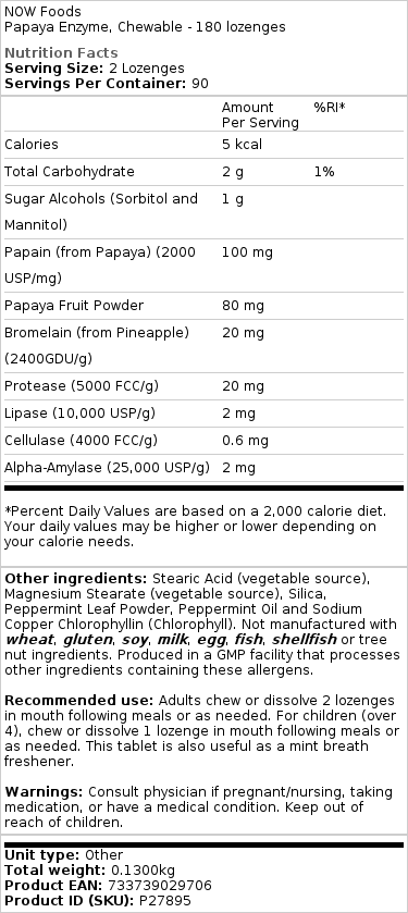 Papaya-enzymer af god kvalitet, der hjælper på mine fordøjelsesproblemer, især efter at have spist bøf, som det er sagt, hjælper det med proteinfordøjelsen. Behagelig smagende pastiller med myntesmag, rene ingredienser. Dosering tager jeg bare 2 efter måltider, når det er nødvendigt. NOW brand er en betroet virksomhed, som jeg godt kan lide. Praktiske at tage med overalt, da de kan tygges.