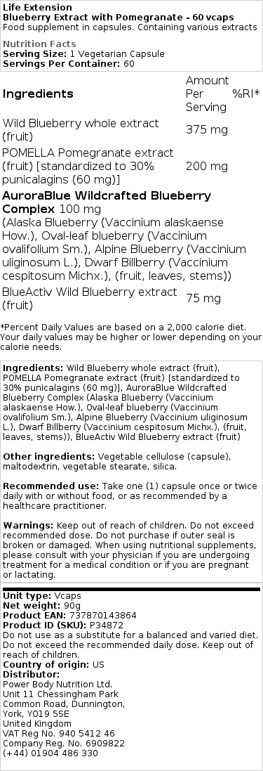 blåbær er meget sunde og giver vigtige sundhedsmæssige fordele, såsom visse phytonutrients, som er svære at få fra mange andre fødevarer. Desværre er det meget svært at købe blåbær, hvor jeg bor, så de friske bær er fraværende i min kost, og jeg er nødt til at stole på kosttilskud for at få nogle af de fordele, bær kan give. disse life extension kosttilskud ser ud til at være af høj kvalitet, primært fordi jeg kan lide, at der er få ingredienser udover blåbær (og granatæblepulver også, hvilket jeg som en anden ingrediens ikke har noget imod). selvfølgelig kan man ikke erstatte fornøjelsen og den lækre smag af friske blåbær med piller, men for os, der bor i visse områder, anbefales dette produkt..