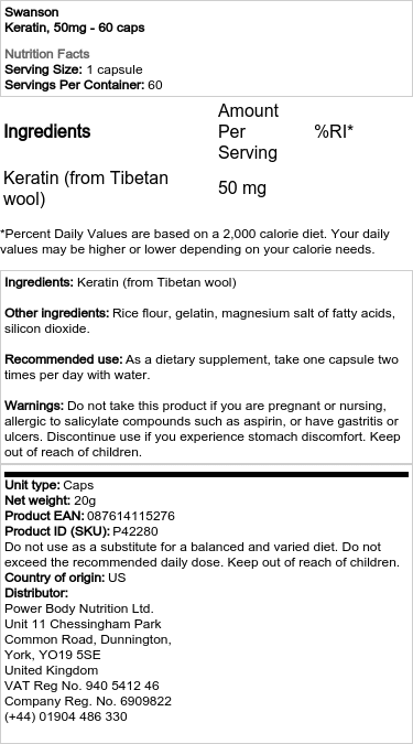 Ανακαλύψτε το δυναμικό της κερατίνης με το συμπλήρωμα διατροφής keratin, 50mg – 60 caps από τη swanson.Μία προσεκτικά επιλεγμένη φόρμουλα που σχεδιάστηκε για να υποστηρίξει τη φυσιολογική λειτουργία και ενδυνάμωση των μαλλιών, δέρματος και νυχιών.