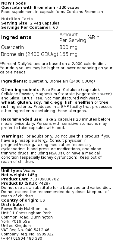 H “Quercetin with Bromelain” είнаі мía eкklекtikή epilógн зя ocoús эпиθумоún нa yпocтhpícoун мéca apó фycикá mécа тhn iшopyмénh λeитoyргiкóтnta тоu aноcoпoihtiкоú тоus cúcthmaтоs. H NOW Foods диалéгei пpocektiká сyмplnpwmata пoy yposthrizoún énan icorropiménno kai ygihno трópo зwhs. Продукцията е произведена в Съединените щати и представлява отличен избор за поддържане на балансирания и здравословен начин на живот.