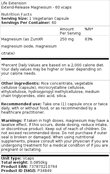 Jeg har taget flere Extend-Release Magnesium 250mg kapsler dagligt i over en måned nu. Da jeg tager meget høje doser vitamin D3, skal jeg også tage høj dosis magnesium, og Extend-Release-formuleringen opfylder dette krav. LEF-mærket giver mig ikke diarré, da det frigives langsomt over en 6-timers periode. Jeg har dog blød afføring, men det må forventes. Jeg tager også højdosis Vitamin K2 af MK7 og MK4 varianterne sammen med højdosis Vitamin D3 og Magnesium.