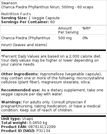 Da jeg hørte om Chanca Piedra, var jeg så begejstret. Jeg ville have noget, der virkelig virkede, og hvis du slår dette produkt op og ser, hvad det er godt for, kan jeg fortælle dig, at det virkelig er det! Swanson-webstedets produktbeskrivelse siger, at denne særlige form for Chanca Piedra er nyttig for nyre- og leversundhed . Det er to områder, som jeg anser for yderst vigtige. Jeg har brugt et halvt dusin, eller deromkring, flasker med disse kapsler, varierende min dosis fra 2 eller 3 om dagen op til 5 to gange om dagen, altid med masser af rent vand, for at søge nogle mærkbare resultater. Det er virkelig svært for mig at sige med sikkerhed og detaljeret; Jeg føler dog, at Chanca Piedra har været til gavn for mig, især i en situation, hvor jeg havde prøvet mange holistiske naturlige produkter før.