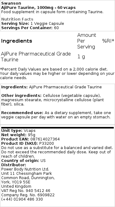 Ανακαλύψτε τη δύναμη της Ταυρίνης με το συμπλήρωμα διατροφής “Taurine, 1000mg – 60 vcaps” από τη Swanson. Κάθε κάψουλα περιέχει 1000mg ταυρίνης, που είναι γνωστή για το ρόλο της στη στήριξη ενός ενεργού και υγιούς τρόπου ζωής.