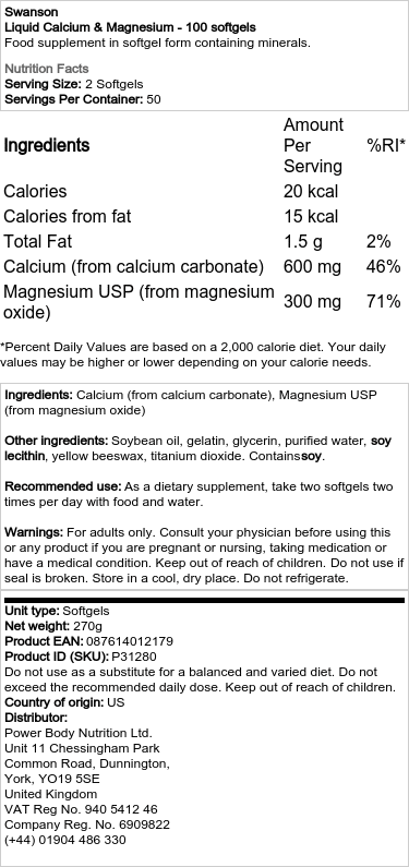 Ανακαλύψτε τη δύναμη του Liquid Calcium & Magnesium – 100 softgels από τη Swanson, ένα προϊόν κορυφαίας ποιότητας από τις ΗΠΑ, σχεδιασμένο να υποστηρίζει τη φυσιολογική λειτουργία των μυών και νεύρων. Ιδανικό για όσους επιθυμούν ν’ αυξήσουν τη δυνάμη και ελκυστικό γι’ αυτούς που επέλεξά μίχθου σωμάτω.
