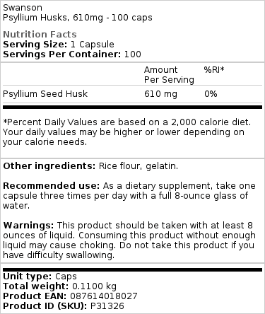 Ανακαλύψτε το δυναμικό των φυσικών συμπληρωμάτων με το “Psyllium Husks,610mg – 100 caps” από τη Swanson.Προέρχεται από υψηλής ποιότητας πηγές στις ΗΠΑ και είναι ιδανικό για όσους επιθυμούν να ενισχύσουν τη δίαιτά τους με φυσικά συστατικά.