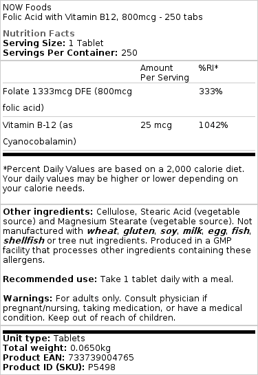 Ανακαλύψτε τη δύναμη του Folic Acid with Vitamin B12, 800mcg – 250 tabs, ένα προϊόν από τη NOW Foods, που σχεδιάστηκε για να υποστηρίζει τον ισορροπημένο και υγιεινό σας τρόπο ζωής. Προέρχεται από τις ΗΠΑ και είναι φτιαγμένο με πρωτόκλασσες πρώτες ύλες.