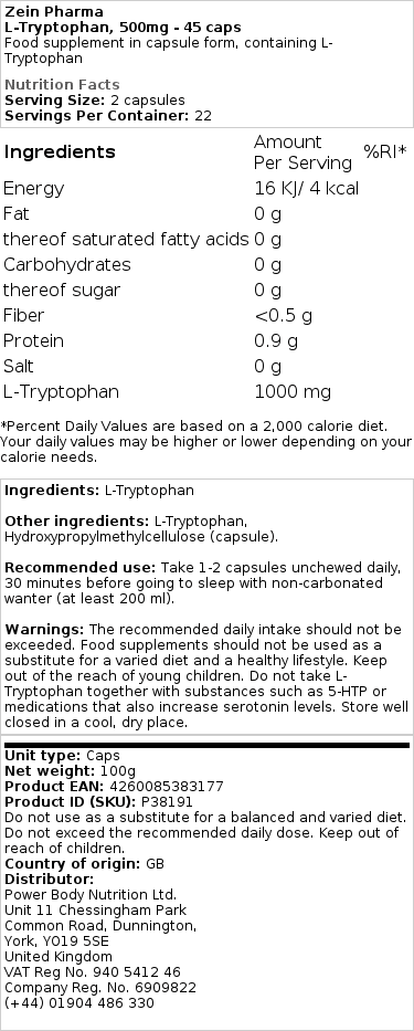 Αυτό τo πpoïón εínai βacicméno cto kathapó kai fycikó L-Tryptophan. Káthe kápcoula pepechi 500 mg L-Tryptophan, eklekto me procoi gia ti ychli kaqarotita kai fyciki katagogi toy.