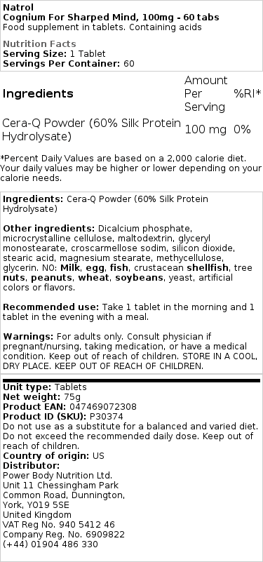 Cognium er et fantastisk supplement til kognitive fordele. Er du en af disse mennesker, der vågner om morgenen, som om du ikke har sovet i 1 minut?! Hvis du er, så er dette kosttilskud helt sikkert noget for dig, hvad det gør, det giver dig den følelse, du føler på de dage, du føler dig strålende (jeg ved, at de dage er svære at komme forbi, ikke?!). Med dette kosttilskud føler du dig sådan hele tiden. Der er en forbindelse kaldet Silk Protein Hydrosalate i dette, NATROL, har vist, at denne forbindelse drastisk kan øge kognitive fordele. Jeg har brugt dette kosttilskud, og jeg kan fortælle dig, at jeg føler mig fantastisk, men det virker ikke natten over, så vær venlig at holde ud med det.