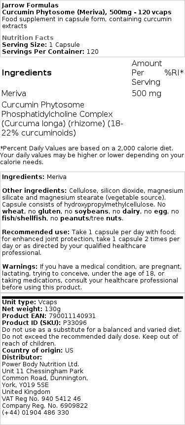 O Curcumin Phytosome (Meriva) apo tin Jarrow Formulas einai mia dynami gia tin ypostirixi tis fysiologikis leitourgias tou organismou kai gia tin enischysi tis kathimerinotitas sas me enan ygieini tropo zoes.Proerchetai apo ton topo tes Amerikanikis epistimis kai texnologias, prosferontas mia ypervoliki poiotita kai asfaleia sto xristi. Epipléon, i sygkekrimeni morfi phytosome voithaei sto kalitero dynato vroxopiisi tou kurkoumin ston organismo, prosferontas megalyteri biothitotita kai apotelesmatikotita.