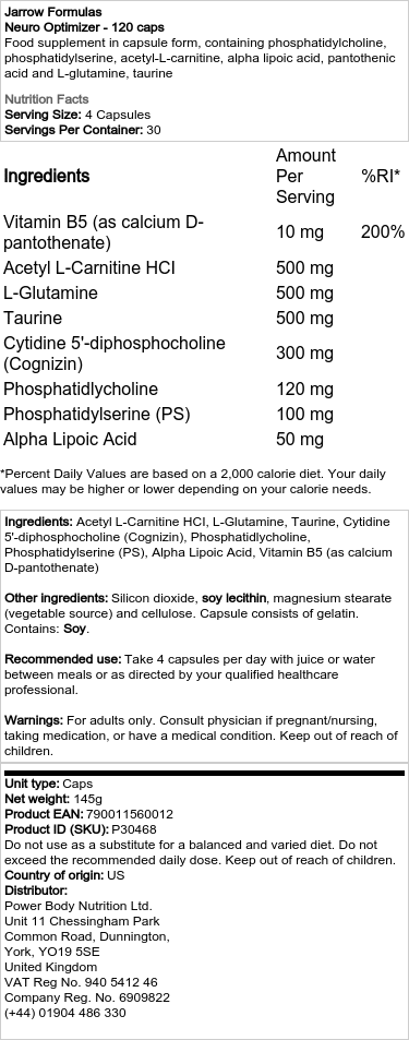 Ανακαλύψτε το Neuro Optimizer – 120 κάψουλες, το προηγμένο διατροφικό συμπλήρωμα από τη Jarrow Formulas, σχεδιασμένο για να υποστηρίζει τη φυσική λειτουργία του εγκεφάλου και να βελτιώνει τη γνωστική απόδοση. Προέρχεται από την Αμερική και είναι ιδανικό για όσους επίδοξους ν’ αυξήσουν φυσiologika tis δυνάμeis tous.