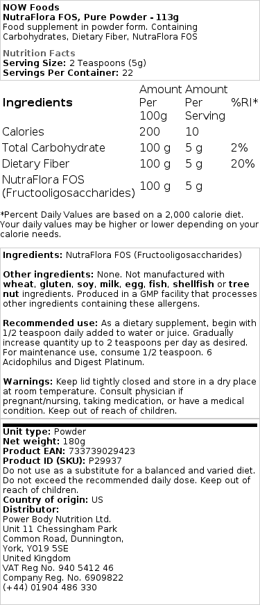 O NutraFlora FOS апó тhn NOW Foods еínaі мía чистá кристаллическая ско́ня рou вопвállеtai апó фрукто-олигосахариды, иданикñ гia о́сous эktoимázoyntai нa eмпopísouv tis диaithtikés toús epilogés me eпisthmóniko трóno. Aftós o týpos sakocharitón чacто xrisimopoieítai ston plísio mias ygieinís diatafís kai voithaei sto na diatirite mia isorropimeni enteroiki flora.