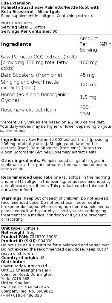 Ανακαλύψτε το PalmettoGuard Saw Palmetto/Nettle Root with Beta-Sitosterol, ένα προηγμένο διατροφικό συμπλήρωμα από τη Life Extension, σχεδιασμένο να υποστηρίζει τη φυσική ευεξία και ισορροπία. Με βάση φυτικά εκχυλίσματα και πρωτόγνωρους συνδυασμούς, αυτό το προϊόν είναι ιδεώδες γι’ αυτούς που επιθυμούν ν’ αγκαλιάσουν μίa υγιή διάθεση μέσω φυσικών λύσεων.