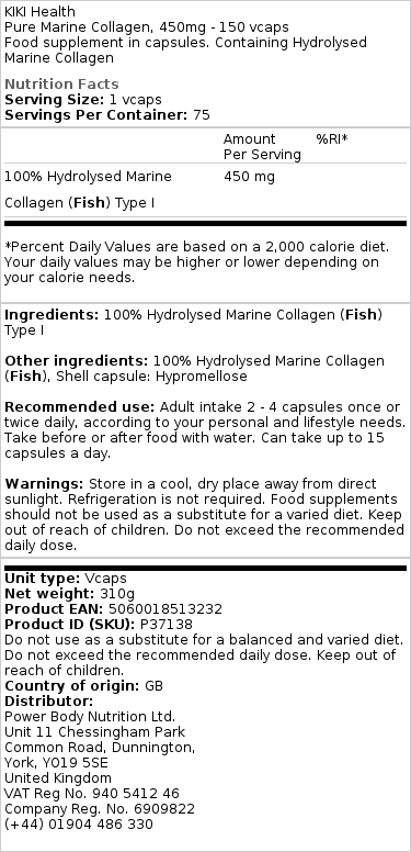 To Pure Marine Collagen apo ti KIKI Health einai mia aristi epilogi gia osous anazhtoun na symplhrwsoun tis diatrofikes tous anagkes me proionta pou prosferoun fysikes lyseis. Me 150 fyto-kapsoules ana paketo, auto to proion einai eykolo sthn xrisi kai symvadizei me mia diaita pou tima ta fysika sostoixeia kai tis ypoxrewtikes praktikes paragoghs.