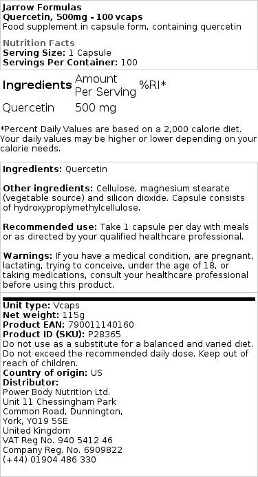 Prisbilligt quercetin-mærke med høj dosis på 500mg. Jeg stoler på dette mærke Jarrow og kan lide det, at det kommer i 200 kapsler. Jeg spurgte Jarrow kundeservice, og de sagde, at deres quercetin stammer fra planten sophora japoni