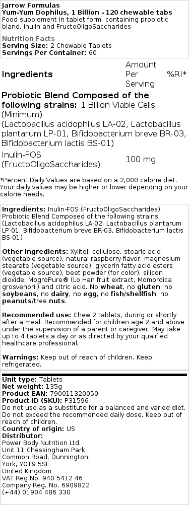 Ανακαλύψτε το Yum-Yum Dophilus, ένα διαιτητικό συμπλήρωμα με 1 δισεκατομμύριο CFU ανά δόση, σε μορφή εύγευστων μασώμενων δισκίων με γεύση βατόμουρου. Ιδανικό για όσους επιθυμούν να υποστηρίξουν τη φυσιολογική λειτουργία του πεπτικού τους συστήματος μέσω ενός νόστιμου και πρακτικού προϊόντος.
